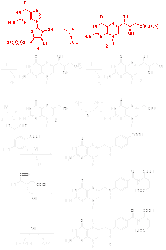 malformation in human embryos. The biosynthesis of tetrahydrofolate has been studied in some detail. The first step of pterin synthesis is of special interest, because it commits GTP (1) to pterin production and is considered to control flux into the pathway.
