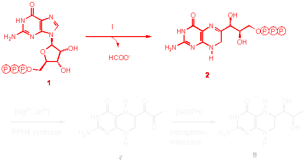 GTP cyclohydrolase I (I; E.C. 3.5.4.16) catalyzes the conversion of GTP (1) to dihydroneopterin triphosphate (2; H2NTP, 6-D-threo-1´,2´,3´-hydroxypropyl-7,8-dihydroneopterin-3´-triphosphate). In plants and certain microorganisms, the enzyme product serves as the first committed intermediate in the biosynthesis of tetrahydrofolate. In animals, dihydroneopterintriphosphate is converted to tetrahydrobiopterin (8; BH4, [6R]-[L-erythro-1´,2´-dihydroxypropyl]-2-amino-4-hydroxy-5,6,7,8-tetrahydropteridine) by the sequential action of 6-pyruvoyl tetrahydropterin synthase ( PTPS; E.C.4.6.1.10) and sepiapterin reductase (E.C. 1.1.1.153).